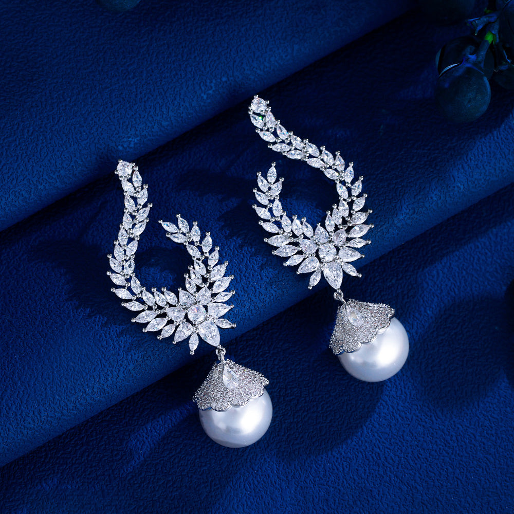 Turn heads on your special day with these Trendy Sparkly Cubic Zirconia & Pearl Long Drop Earrings – the perfect blend of modern glamour and classic charm. Featuring brilliant-cut white CZ stones and a stunning big pearl accent, these long dangle earrings are designed to catch the light with every move.