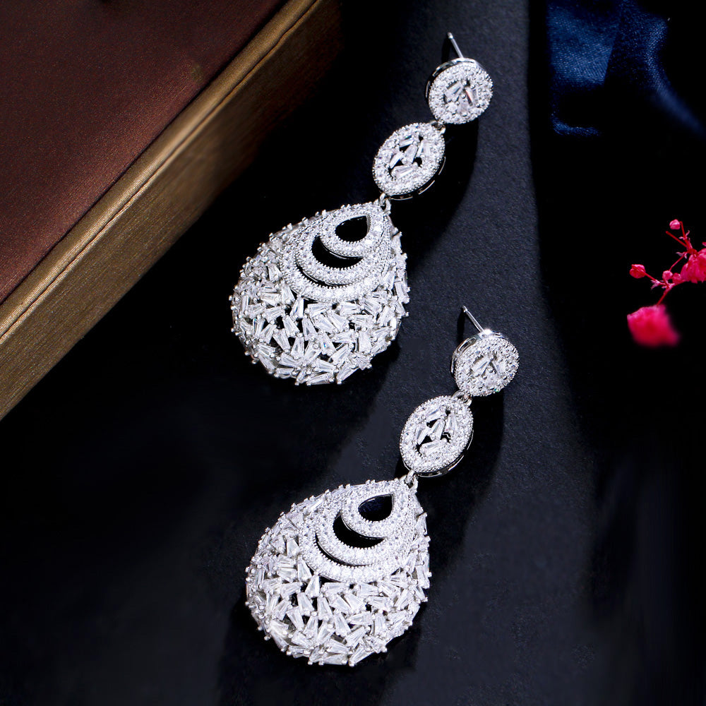 Long drop dangle earrings with shimmering white cubic zirconia stones